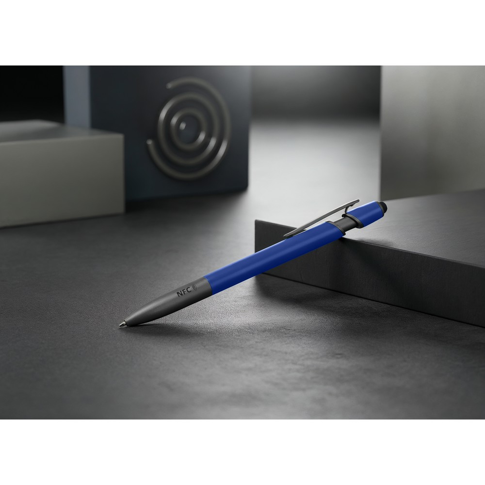 Długopis z chipem NFC (Near Field Communication), działa z urządzeniami posiadającymi technologię NFC, posiada matowy trzon o gumowym wykończeniu i elementy w grafitowym kolorze, końcówka touch pen umożliwia obsługę ekranów dotykowych, wkład w niebieskim kolorze, grawer ukazuje lśniącą powierzchnię. NFC to międzynarodowy standard komunikacji bezprzewodowej wymiany danych na niewielkie odległości. Umieszczony w długopisie chip umożliwia zapisanie na nim np. adresu strony internetowej, który zostanie odczytany przez urządzenie z technologią NFC po zbliżeniu go do logotypu NFC znajdującego się na produkcie. Produkt wykonany z aluminium z recyklingu oraz plastiku.