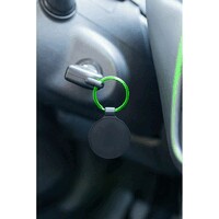 Okrągły brelok do kluczy z dedykowanym miejscem pod znakowanie, grawer ukazuje kolorową powierzchnię, czarne pudełko podarunkowe w komplecie, produkt wykonany z metalu
