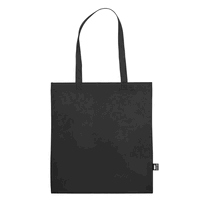 Torba na zakupy wykonana z RPET, posiada długie uchwyty umożliwiające noszenie na ramieniu, ikona RPET na metce, produkt wykonany z non-woven RPET 75 g/m2