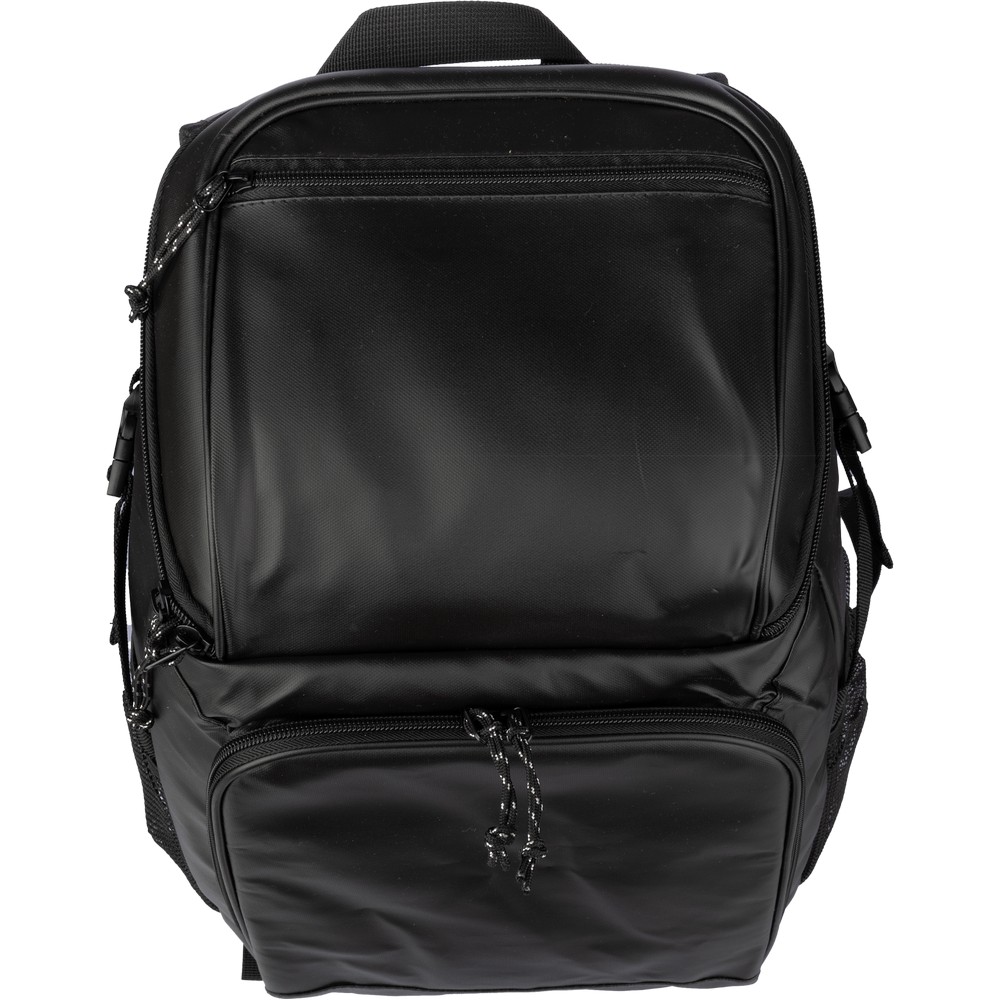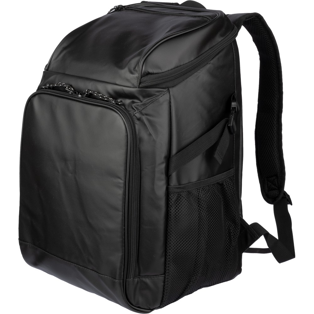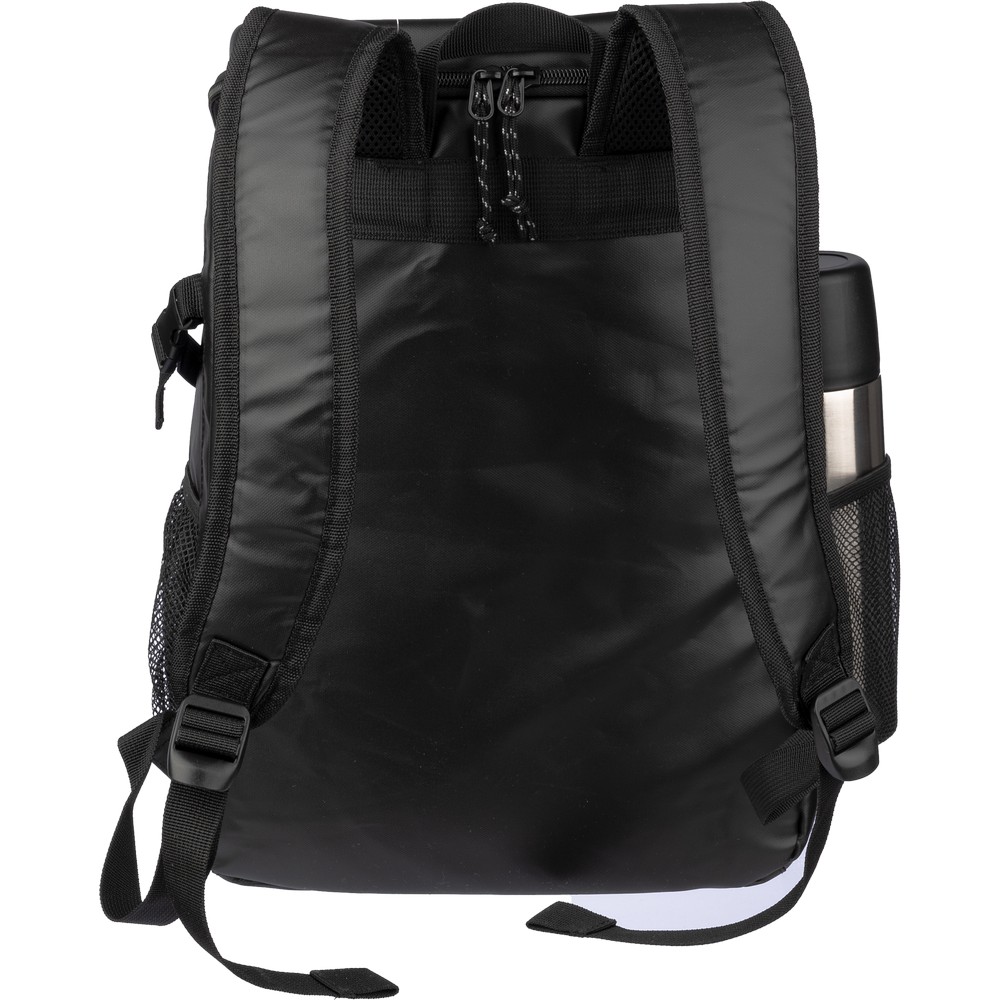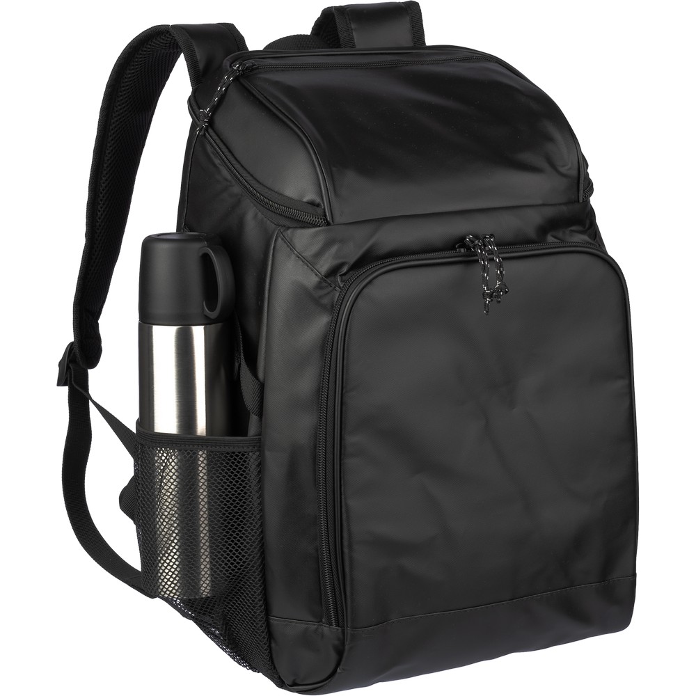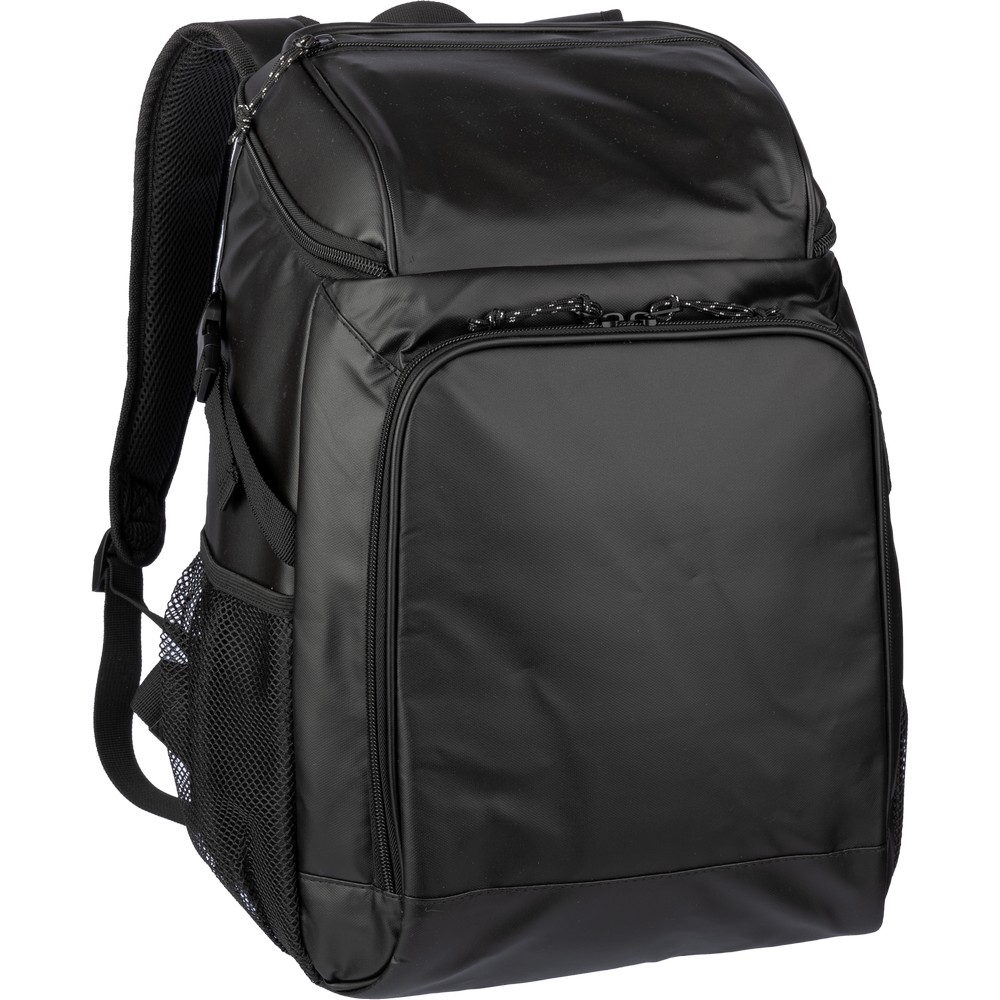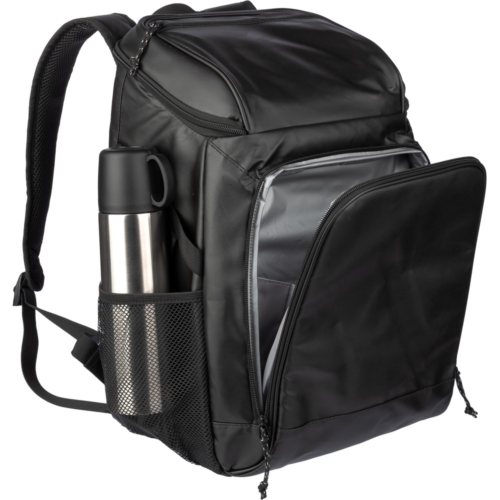 Plecak termoizolacyjny, przegroda główna oraz przednia kieszeń na zamek błyskawiczny, posiada boczną kieszeń siateczkową z elastyczną taśmą zamykającą, wodoodporne wnętrze, pomoże zachować świeżość żywności oraz napojów, produkt wykonany z poliestru