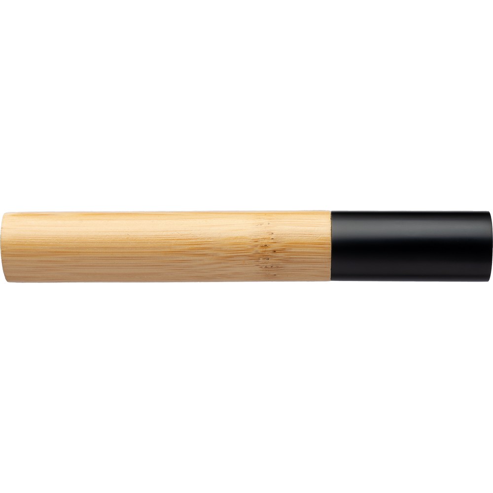 Długopis przekręcany z bambusowym trzonem, posiada niebieski wkład, bambusowa tuba chroniąca przed zniszczeniem w komplecie, produkt wykonany ze stali nierdzewnej