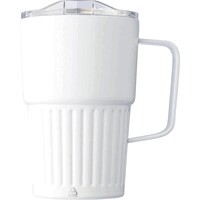 Kubek termiczny 450 ml ze stali nierdzewnej, posiada podwójne ścianki, które spowalniają oddawanie temperatury na zewnątrz, zewnętrzna część wykonana jest ze stali nierdzewnej 201, a wewnętrzna ścianka ze stali nierdzewnej 304, uchwyt ułatwiający noszenie, wieczko z zamknięciem wykonane z AS, ikona recyklingu na produkcie, zapakowany w brązowe kartonowe pudełko