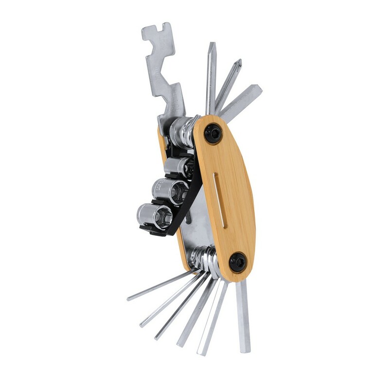 Narzędzie wielofunkcyjne, zestaw narzędzi rowerowych, 15 funkcji, 6 kluczy imbusowych, płaski śrubokręt, śrubokręt krzyżakowy, klucz płaski, 3 nasadki sześciokątne i adapter, produkt wykonany z bambusa i stali węglowej