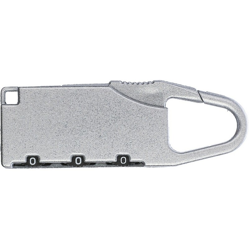 Kłódka podróżna z karabińczykiem umożliwiającym przypinanie, sprawdzi się podczas podróży jako zabezpieczenie walizki, produkt wykonany z metalu