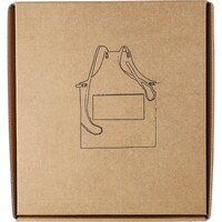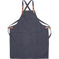 Fartuch kuchenny z denimu, do noszenia na ramionach poprzez włożenie pasków w dołączone szlufki z boku, 2 przednie kieszenie z przodu, zapakowany w brązowy kartonik, produkt wykonany z denimu, bawełny 65%/35%, poliestru o gramaturze 280 g/m2
