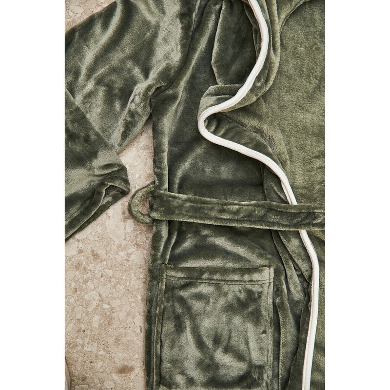 Szlafrok, wykonany w 70% z RPET, 2 kieszenie z przodu, możliwość zawiązania w pasie, szeroki kołnierzyk, spełnia wymagania standardu OEKO-TEX 100