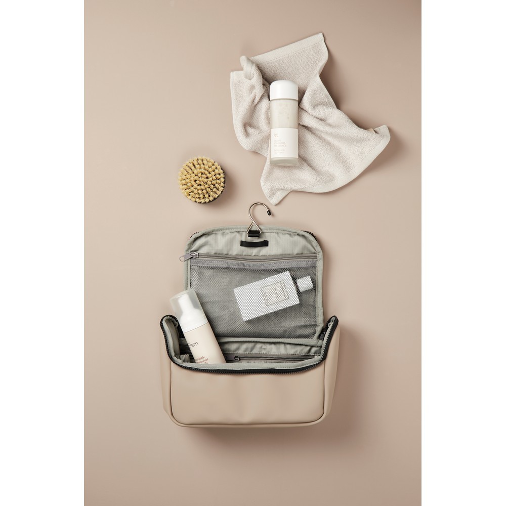 Kosmetyczka, wykonana z wodoodpornego nubuku i PU, mniejsze kieszenie wewnątrz, posiada haczyk do zawieszenia, łatwa w czyszczeniu