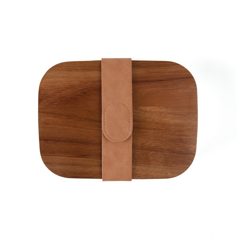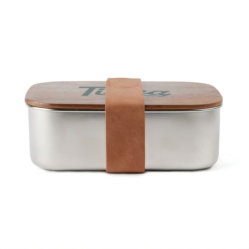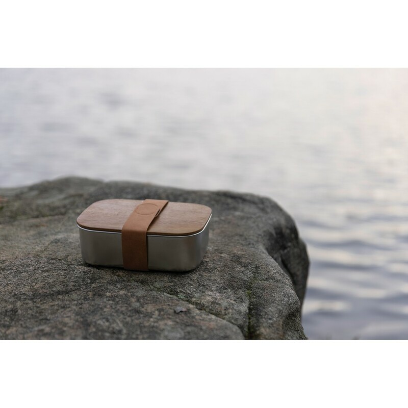 Pudełko śniadaniowe, lunchbox, drewniana pokrywka, pasek na rzep, wykonane ze stali nierdzewnej z recyklingu, całkowita zawartość materiałów z recyklingu obliczona na podstawie wagi całkowitej przedmiotu: 40%, wyłącznie mycie ręczne, w pudełku z papieru kraftowego z certyfikatem FSC®