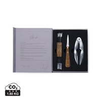 Zestaw do serwowania owoców morza, nóż do ostryg, szczypce oraz 4 widelce do owoców morza, wykonany ze stali nierdzewnej oraz drewna jesionowego z certyfikatem FSC®, unikatowe opakowanie ozdobne z instrukcją otwierania ostryg w komplecie