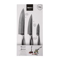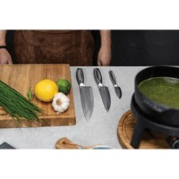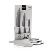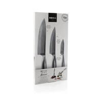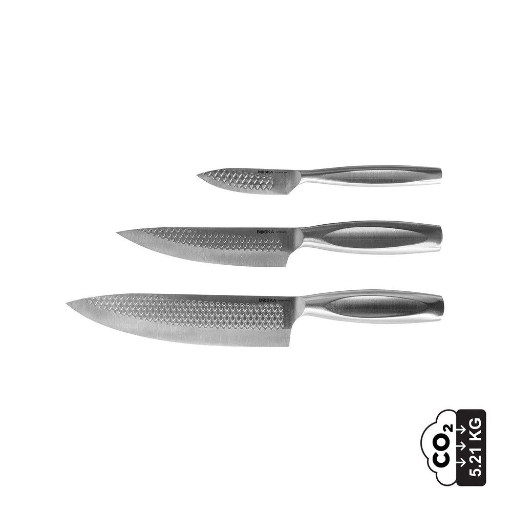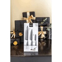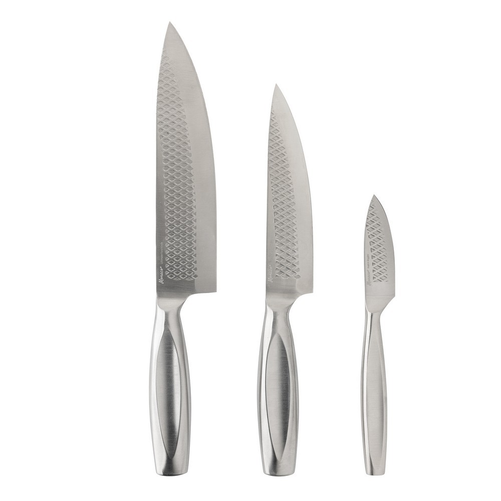 Zestaw noży kuchennych, wykonany ze stali nierdzewnej, nóż uniwersalny, nóż szefa kuchni oraz nóż do obierania, wyłącznie mycie ręczne, posiada dożywotnią gwarancję