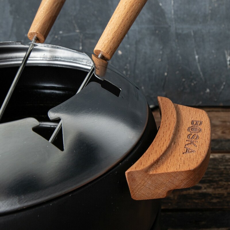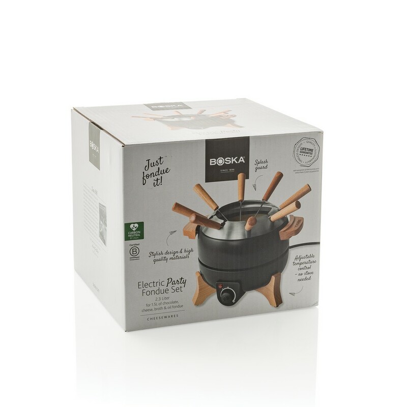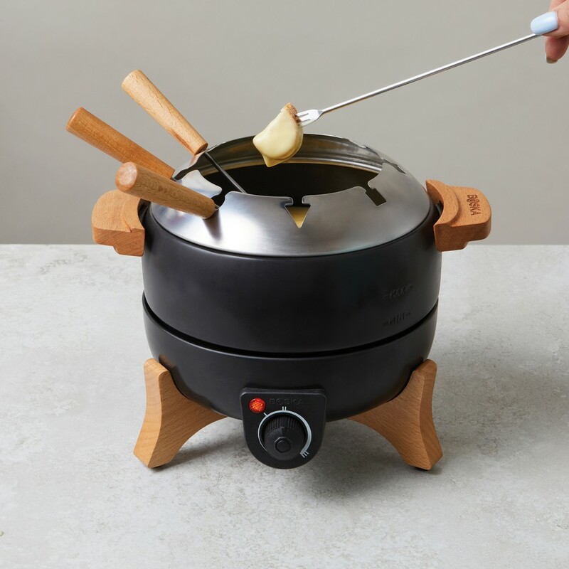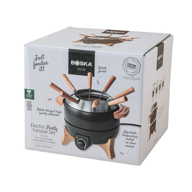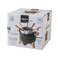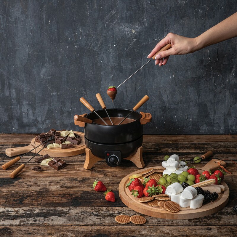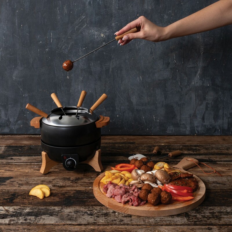 Elektryczny zestaw do fondue, pojemność do 1,5 l, ceramiczna powłoka wewnątrz, zasilany prądem z sieci (230V), kabel o długości 2 m w komplecie, precyzyjna kontrola temperatury, drewniane uchwyty