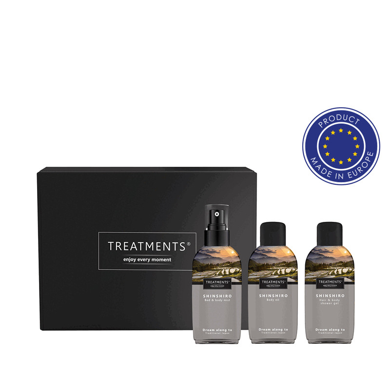 Zestaw kosmetyków Body & Fragnance Mailbox TREATMENTS, przeznaczony dla kobiet i mężczyzn, w zestawie znajduje się: mgiełka do ciała i pościeli 50 ml, olejek do ciała 50 ml, żel pod prysznic do włosów i ciała 50 ml, elegancki, papierowy kartonik, w którym zapakowane są kosmetyki, sprawdzą się w codziennej pielęgnacji, dostępne są różne warianty zapachowe: 03 - Ceylon, 06 - Mahayana, 11 - Uyuni, 19 - Shinshiro. Znakowanie produktu jest możliwe tylko na srebrnej lub złotej folii z czarnym nadrukiem albo na czarnej apli ze srebrnym lub złotym nadrukiem.