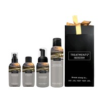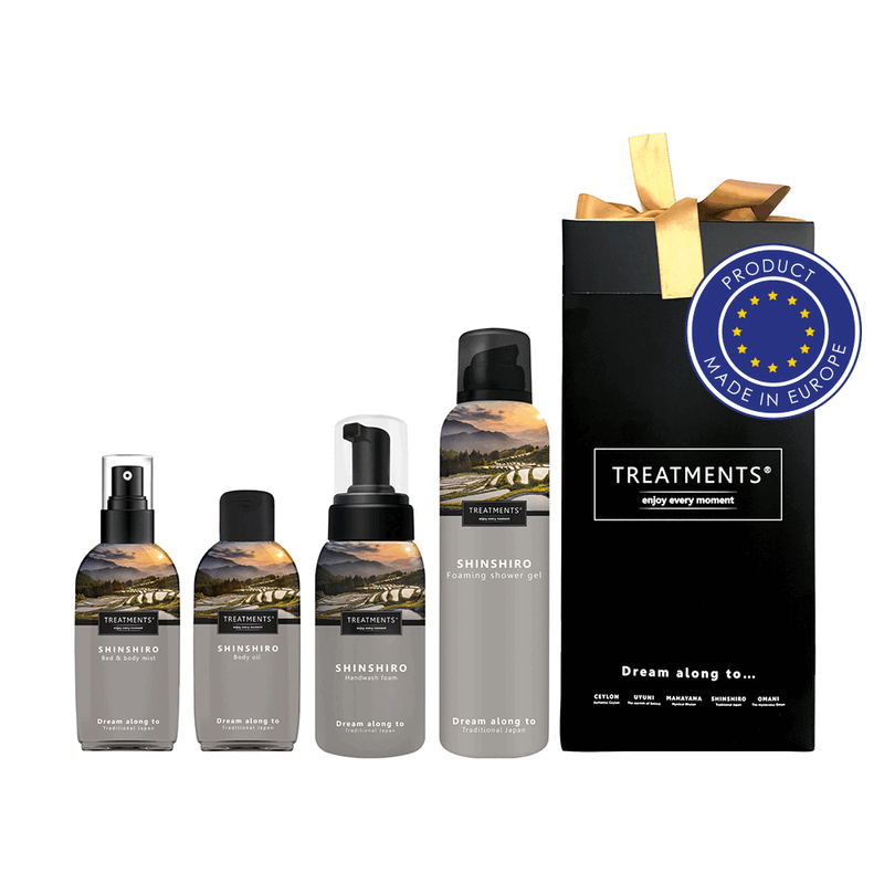 Zestaw kosmetyków Medium TREATMENTS, przeznaczony dla kobiet i mężczyzn, w zestawie znajduje się: mgiełka do ciała i pościeli 50 ml, olejek do ciała 50 ml, pieniący się żel pod prysznic 200ml, pianka do mycia rąk 250 ml, elegancki, papierowy kartonik, w którym zapakowane są kosmetyki, sprawdzą się w codziennej pielęgnacji, dostępne są różne warianty zapachowe: 03 - Ceylon, 06 - Mahayana, 11 - Uyuni, 19 - Shinshiro. Znakowanie produktu jest możliwe tylko na srebrnej lub złotej folii z czarnym nadrukiem albo na czarnej apli ze srebrnym lub złotym nadrukiem.