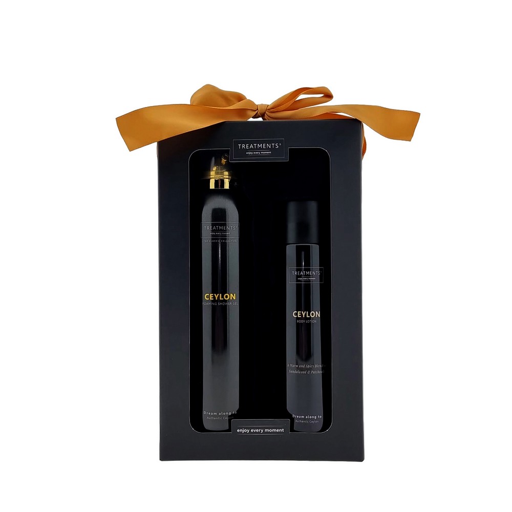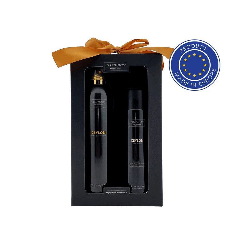 Zestaw kosmetyków Tenderness TREATMENTS, przeznaczony dla kobiet i mężczyzn, w zestawie znajduje się: pieniący się żel pod prysznic 200 ml, balsam do ciała 250 ml, elegancki, papierowy kartonik, w którym zapakowane są kosmetyki, sprawdzą się w codziennej pielęgnacji, dostępne są różne warianty zapachowe: 03 - Ceylon, 06 - Mahayana, 08 - Omani, 11 - Uyuni, 16 - Zhejinag, 19 - Shinshiro, 21 - Verona, 98 - Samoa. Znakowanie produktu jest możliwe tylko na srebrnej lub złotej folii z czarnym nadrukiem albo na czarnej apli ze srebrnym lub złotym nadrukiem.