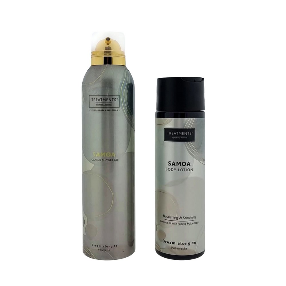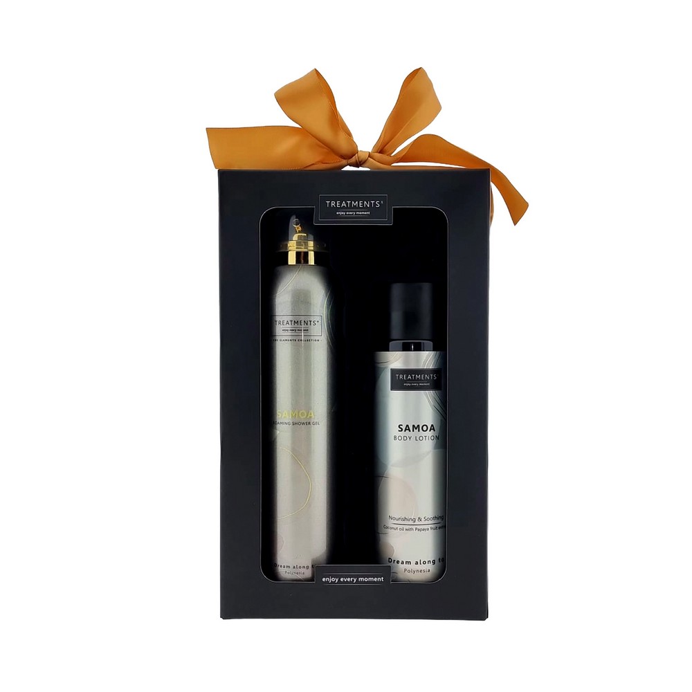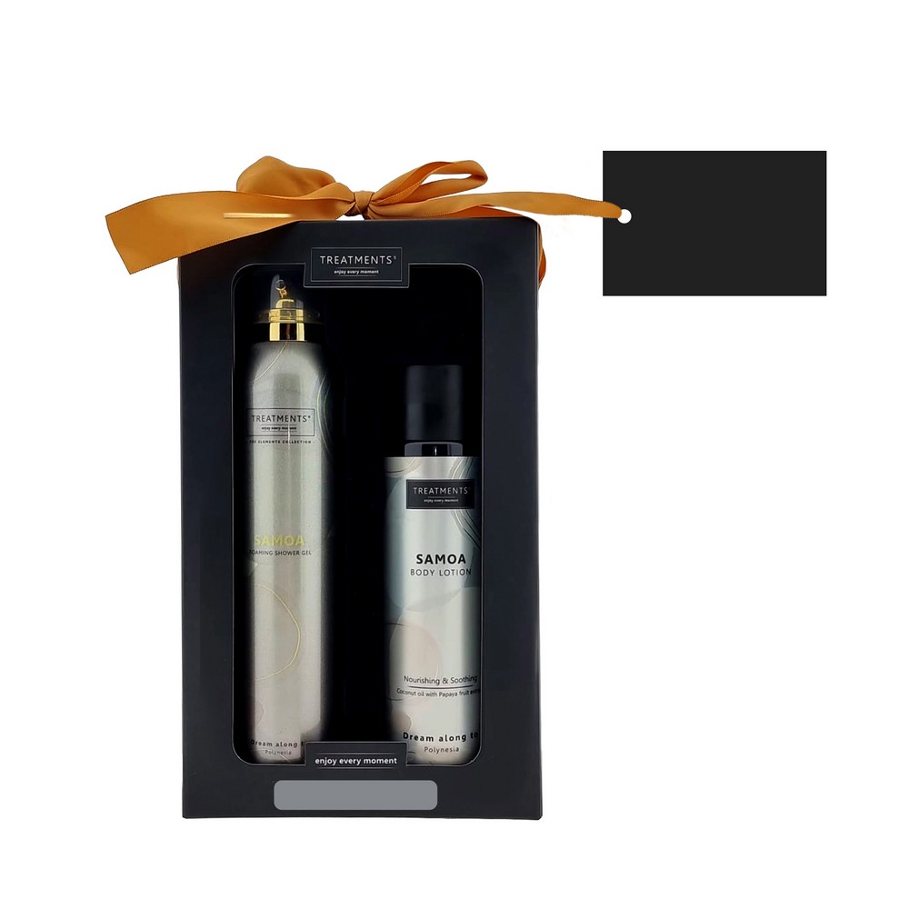 Zestaw kosmetyków Tenderness TREATMENTS, przeznaczony dla kobiet i mężczyzn, w zestawie znajduje się: pieniący się żel pod prysznic 200 ml, balsam do ciała 250 ml, elegancki, papierowy kartonik, w którym zapakowane są kosmetyki, sprawdzą się w codziennej pielęgnacji, dostępne są różne warianty zapachowe: 03 - Ceylon, 06 - Mahayana, 08 - Omani, 11 - Uyuni, 16 - Zhejinag, 19 - Shinshiro, 21 - Verona, 98 - Samoa. Znakowanie produktu jest możliwe tylko na srebrnej lub złotej folii z czarnym nadrukiem albo na czarnej apli ze srebrnym lub złotym nadrukiem.