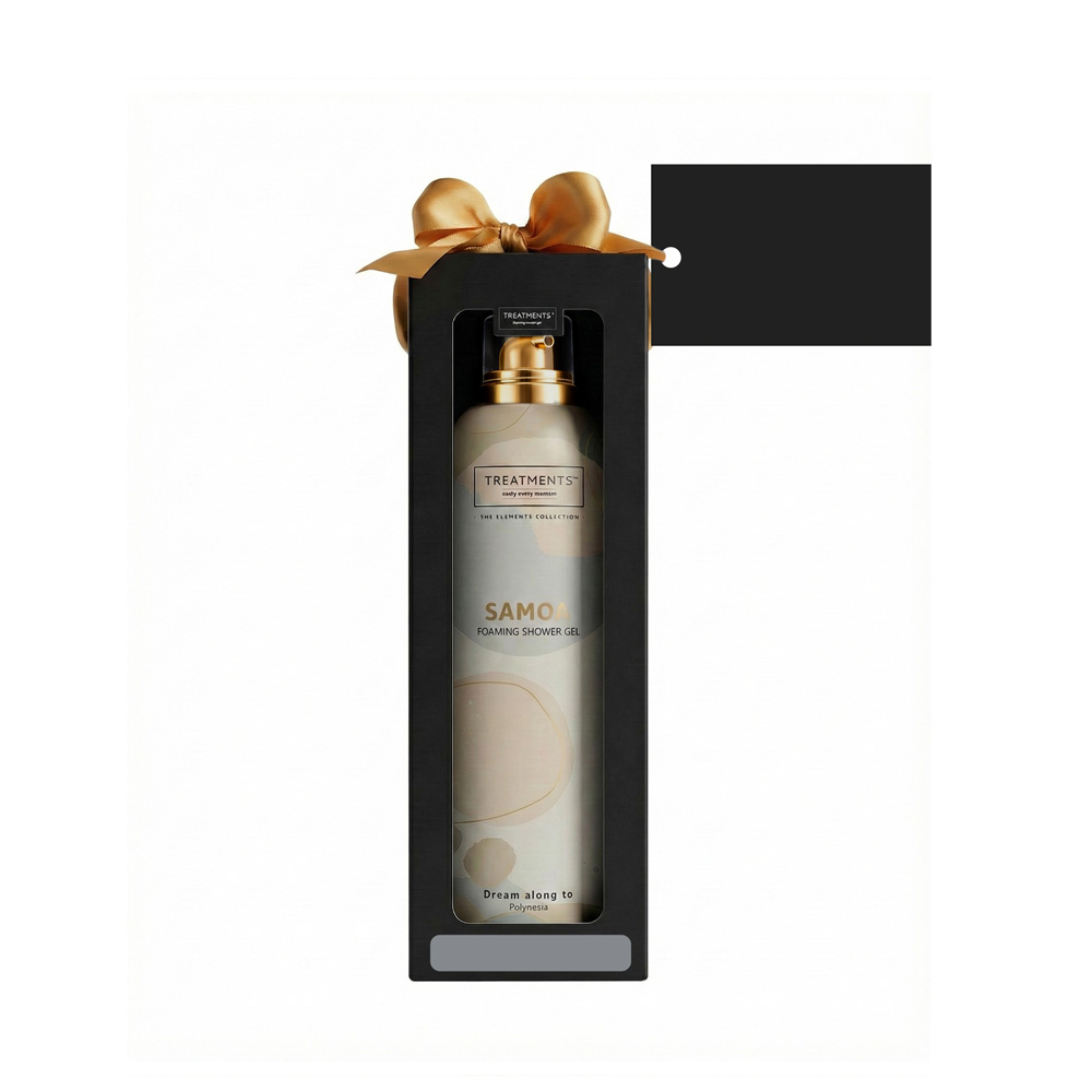 Pieniący się żel pod prysznic TREATMENTS, przeznaczony dla kobiet i mężczyzn, 200 ml, zapakowany w elegancki kartonik, sprawdzi się w codziennej pielęgnacji, dostępne różne warianty zapachowe: 03 - Ceylon, 06 - Mahayana, 08 - Omani, 11 - Uyuni, 16 - Zhejinag, 19 - Shinshiro, 21 - Verona, 98 - Samoa. Znakowanie produktu jest możliwe tylko na srebrnej lub złotej folii z czarnym nadrukiem albo na czarnej apli ze srebrnym lub złotym nadrukiem.